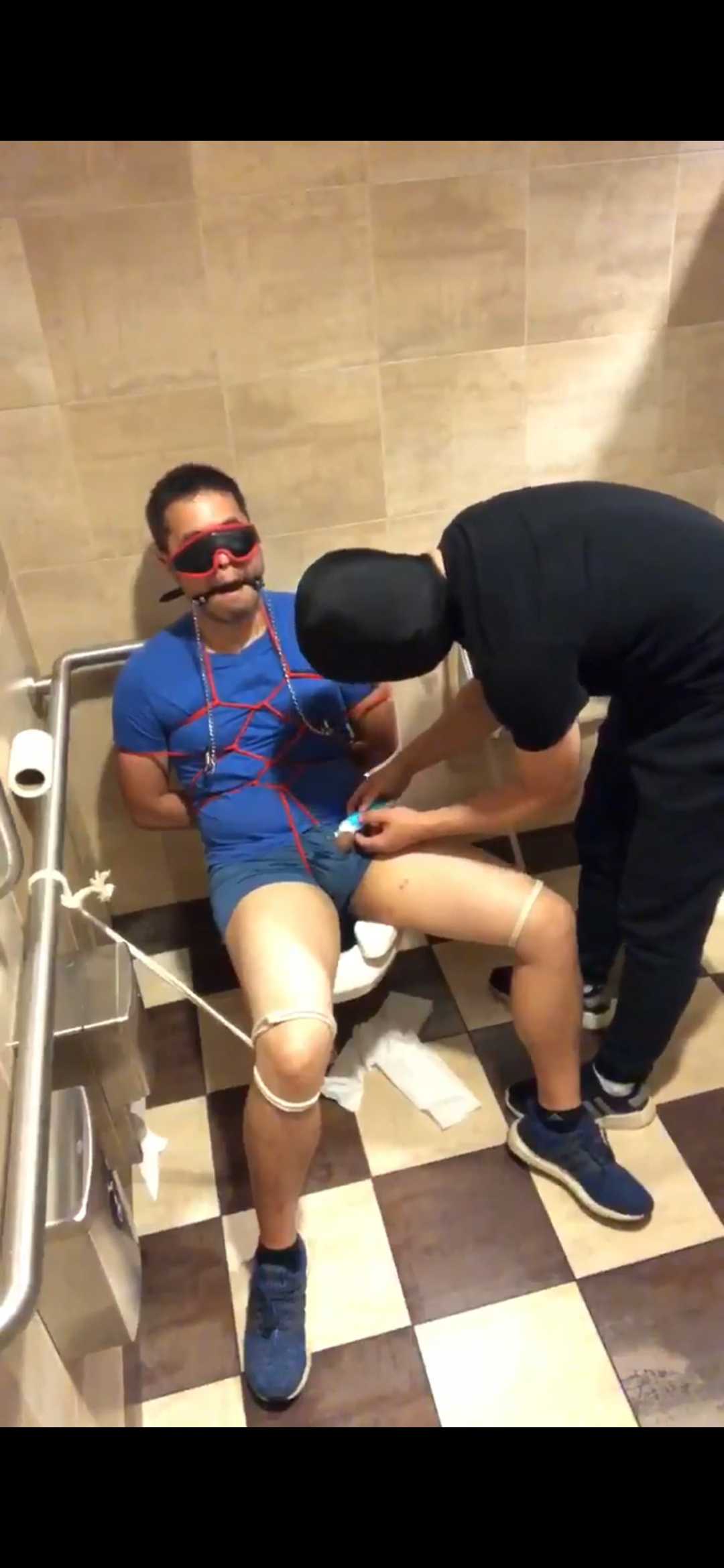两厕奴公厕里全裸被捆绑,被主人尿一身后,主人还邀请路人过来一起尿