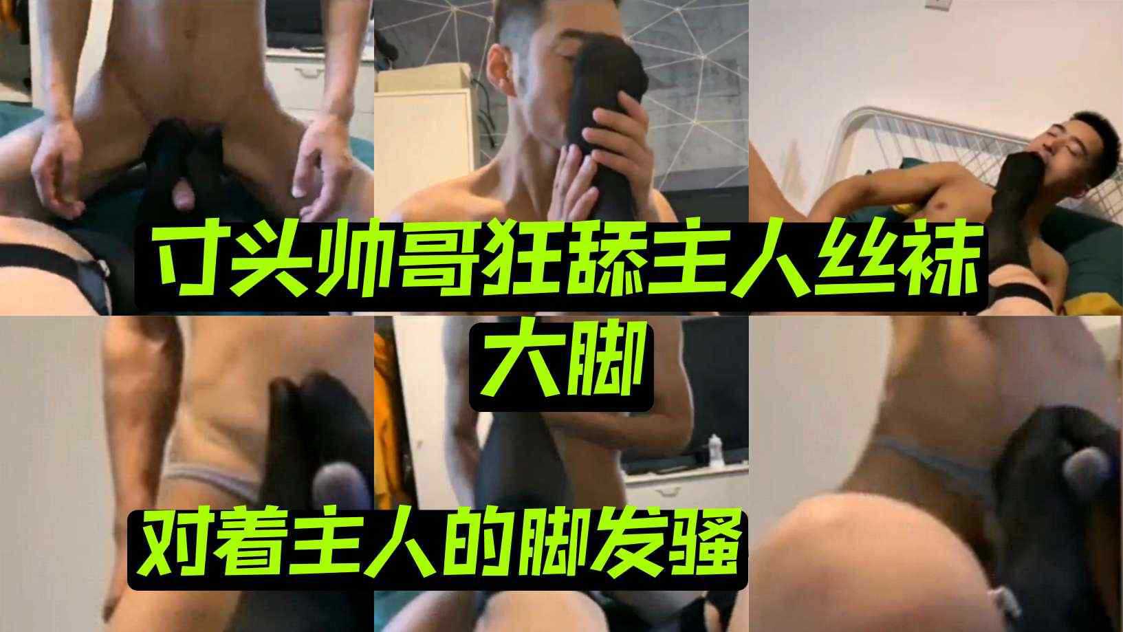 寸头帅哥狂舔主人丝袜大脚 对着主人的脚发骚