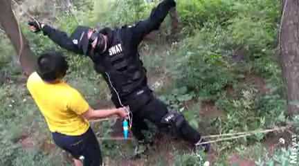 特警被绑在树上打飞机