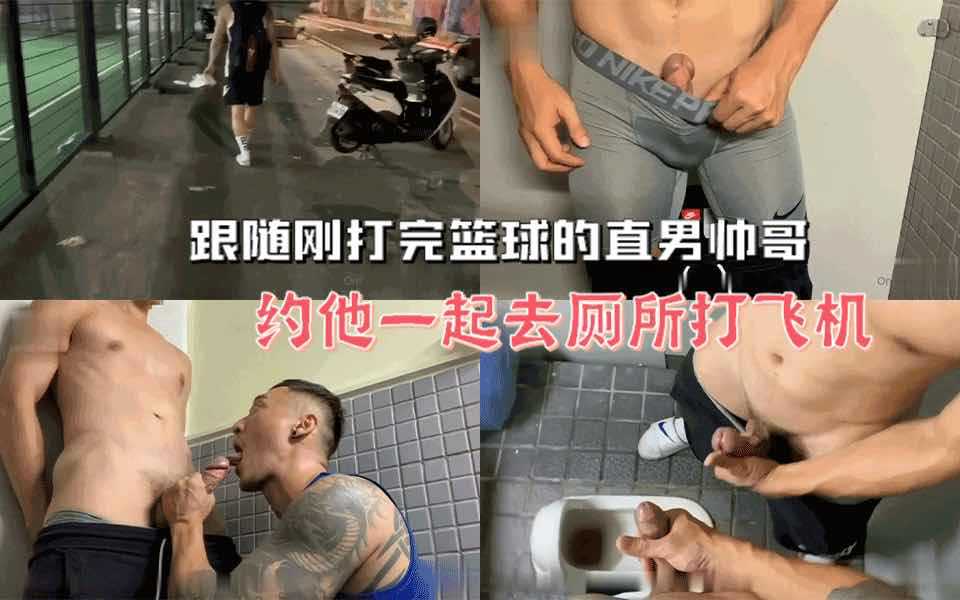 跟随刚打完篮球的直男帅哥,调戏他一起去公厕打飞机