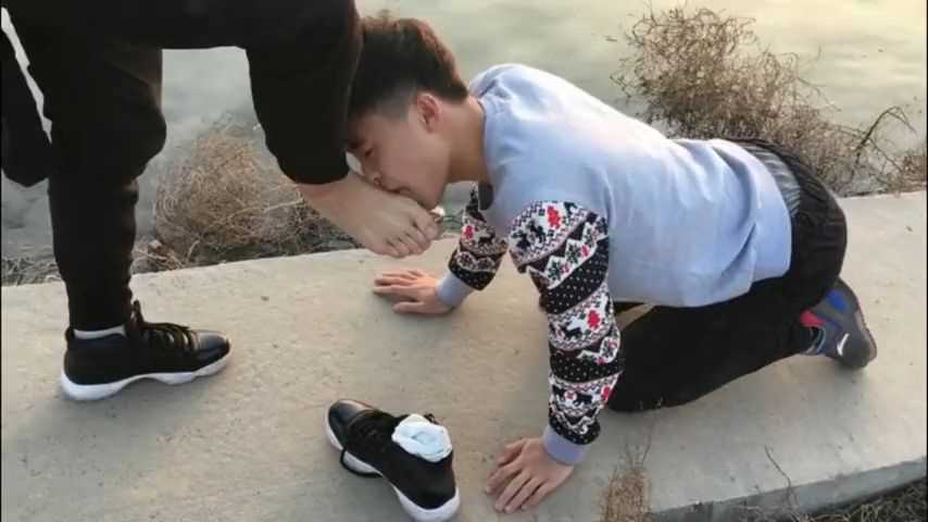 男同gay视频舔脚 脚奴舔得满嘴汗味,调教得他鸡巴一直硬着