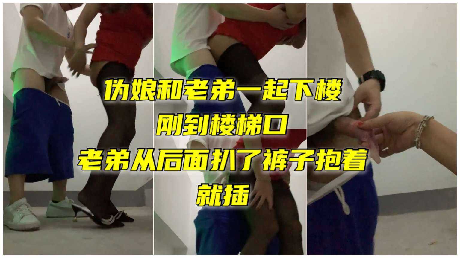伪娘和老弟一起下楼 刚到楼梯口 就从后面扒了裤子抱着就插